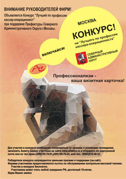 В рамках конкурса участникам предстоит ответить на специальные контрольные вопросы, которые включают в себя не только технические и юридические моменты каждодневной деятельности кассира (работа на ККТ, заполнение специальных бланков и форм КМ-2, КМ-3, КМ-4, КМ-6, КМ-8, КМ-9 , эквайринг, работа с банковскими платежными пластиковыми картами и т.д.). А также основы бухгалтерского учета и азы законода-тельной базы о правах потребителей.